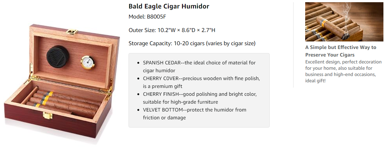 • Size: 9*5.6*2.7 inches(exterior) 8*4.6*1.5 inches(interior). Suggest put your cigar box in cooler environment.